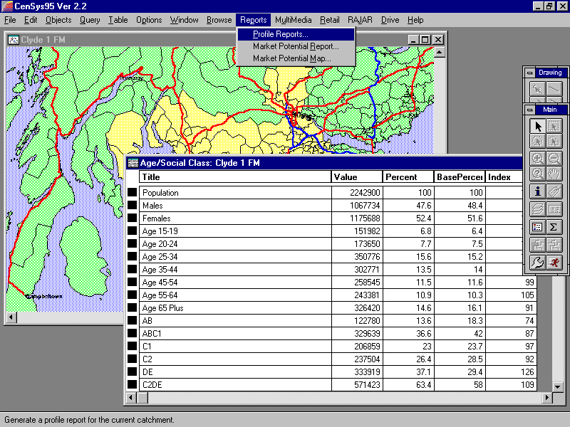 Once saved, demographic reports can be generated showing counts from the 1991 Census or the geodemographic profile of the neighbourhood as described by discriminators such as Super Profiles. GIS functionality enables the production of thematic maps illustrating the areal distribution of particular counts, eg 'percent households with three more cars' or 'percent population aged 55-64'.